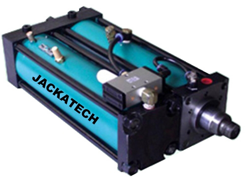 杰瑞特氣液增力缸先由大面積活塞端的低氣壓產生小面積的高液壓,高液壓直接作用在雙支承工作缸活塞桿的大面積柱塞端,然后將力直接傳遞給與工作缸活塞桿別一端通過螺紋相連的施力部分。